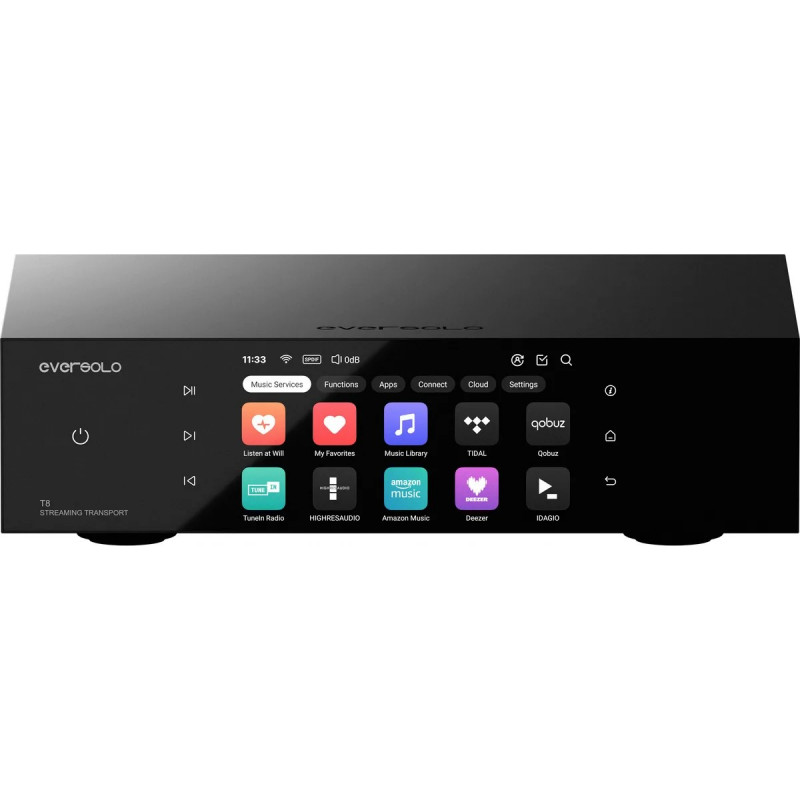 Avec l'EverSolo T8, la marque signe un transport réseau sans compromis, où chaque détail technique vise à préserver l’intégrité du signal numérique. Son châssis massif, son horloge femtoseconde, son alimentation linéaire et sa connectique isolée en font un maillon idéal pour exploiter tout le potentiel d’un DAC haut de gamme ou d'un ampli avec entrées numériques. À cela s’ajoutent une interface tactile moderne, des outils de calibrage puissants et une compatibilité avec la majorité des formats audio Hi-Res et des services de streaming.
