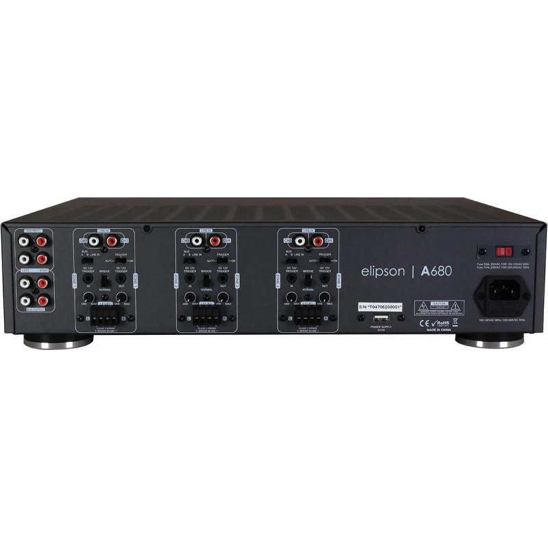 La connectique de l'amplificateur de puissance Elipson A680 comprend deux entrées BUS RCA stéréo qui permettent de diffuser les sources connectées vers les trois zones amplifiées. Les sorties BUS correspondantes permettent pour leur part de ressortir le signal vers un autre amplificateur si nécessaire. Chaque zone dispose également d'une entrée ligne RCA stéréo avec un réglage de gain pour chaque voie, d'une entrée et d'une sortie Trigger 12V ainsi que de borniers d'enceintes stéréo à vis de type Phoenix. Enfin, un port USB alimenté (5V/2A) est présent pour l'alimentation d'un récepteur audio sans fil.