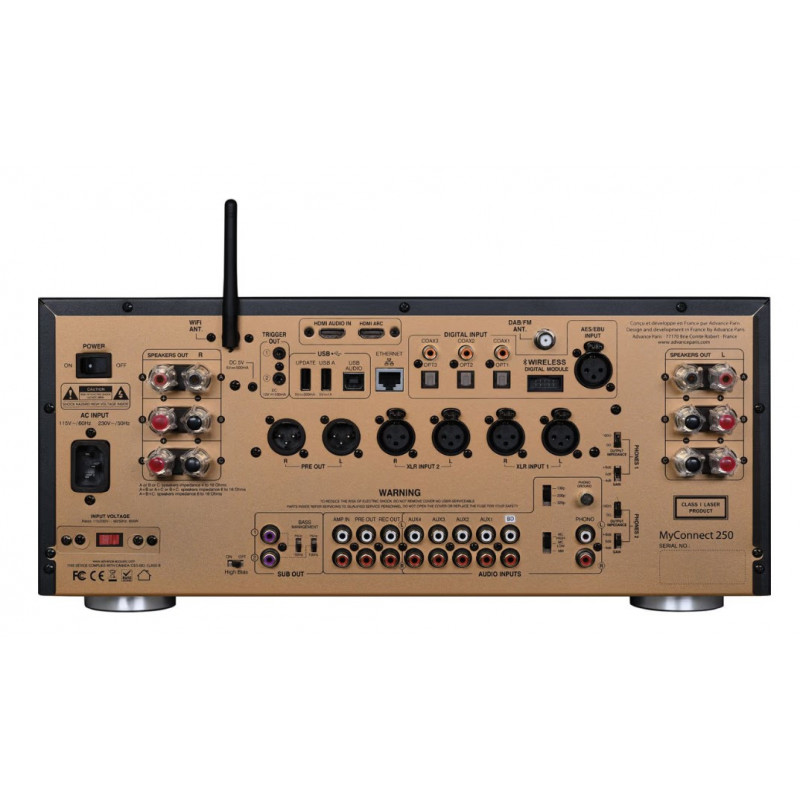 L'ampli Advance Paris My Connect 250 est un modèle connecté capable de délivrer jusqu'à 2 x 190 watts sous 8 ohms. Il est équipé d'un lecteur CD, d'un tuner FM/DAB ainsi que de nombreuses entrées analogiques et numériques, dont deux entrées HDMI. Il peut lire de la musique partagée sur le réseau local (DLNA) ou diffusée à partir de nombreux services de musique en ligne comme Spotify, Qobuz, Deezer, Tidal ou TuneIn. L'ampli Advance Paris My Connect 250 peut également être utilisé comme DAC USB avec un ordinateur Windows ou Mac. Son convertisseur haut de gamme assure une parfaite lecture des flux PCM jusqu'à 32 bits / 384 kHz et DSD 5,6 MHz.