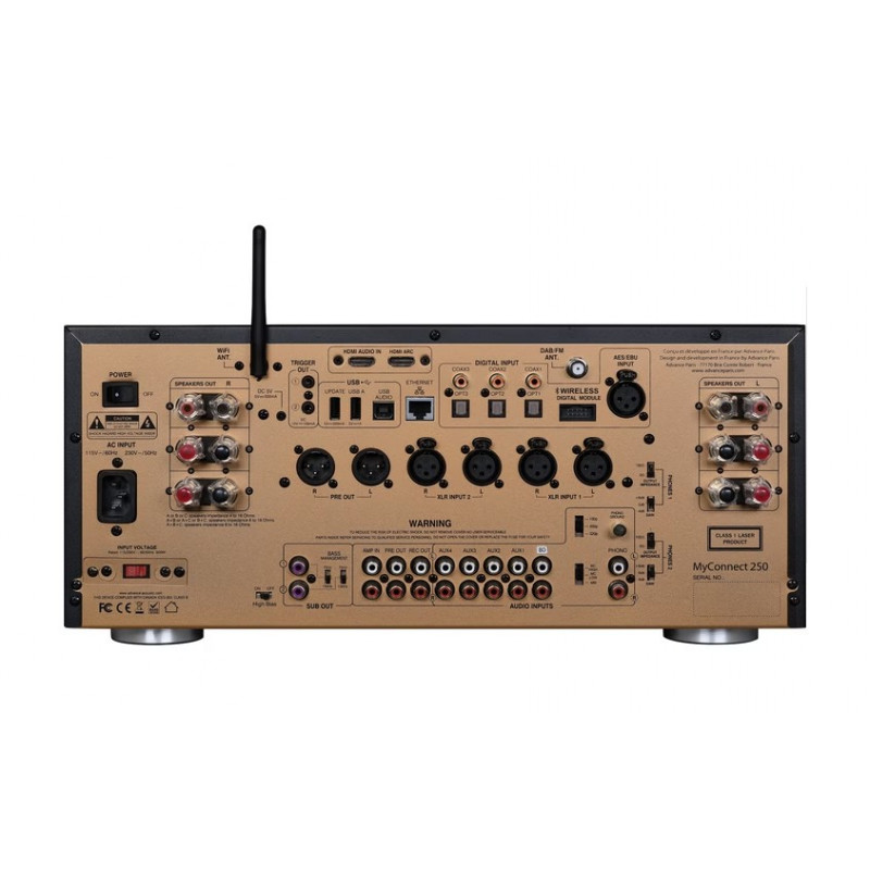 L'ampli Advance Paris My Connect 250 est un modèle connecté capable de délivrer jusqu'à 2 x 190 watts sous 8 ohms. Il est équipé d'un lecteur CD, d'un tuner FM/DAB ainsi que de nombreuses entrées analogiques et numériques, dont deux entrées HDMI. Il peut lire de la musique partagée sur le réseau local (DLNA) ou diffusée à partir de nombreux services de musique en ligne comme Spotify, Qobuz, Deezer, Tidal ou TuneIn. L'ampli Advance Paris My Connect 250 peut également être utilisé comme DAC USB avec un ordinateur Windows ou Mac. Son convertisseur haut de gamme assure une parfaite lecture des flux PCM jusqu'à 32 bits / 384 kHz et DSD 5,6 MHz.