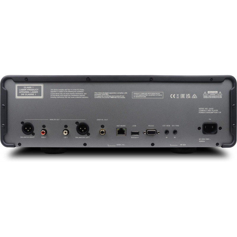 En sortie du DAC, le lecteur CD Michi Q430 propose une sortie asymétrique RCA et symétrique XLR pour faciliter son association à tout ampli ou pré-ampli hi-fi. En complément, une sortie numérique coaxiale est également présente, autorisant l’utilisation du Michi Q430 comme transport CD en association à un DAC ou ampli-DAC externe. Pratique, une entrée trigger permet de synchroniser le déclenchement avec d'autres électroniques, tandis que le port IR facilite le contrôle lorsque l'ampli est placé dans un meuble. Enfin, un port RS232 autorise son intégration dans un système domotique.