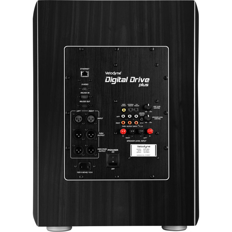Afin de s'implémenter de manière transparente dans tout système home-cinéma ou hi-fi, le caisson de basses Velodyne Digital Drive Plus 15 met à disposition de nombreuses entrées : deux entrées RCA, une entrée LFE, une entrée XLR et une entrée haut-niveau. Il est ainsi possible de le relier à une sortie subwoofer, une sortie pré-out ou encore sur les borniers d'enceintes de l'ampli. Des sorties RCA et XLR sont également disponibles, ainsi que de nombreux ports de contrôle : entrée et sortie RS-232, entrée Ethernet RJ45, sortie vidéo, prise trigger, etc. Il peut ainsi se piloter facilement à distance et être intégré dans un système domotique.