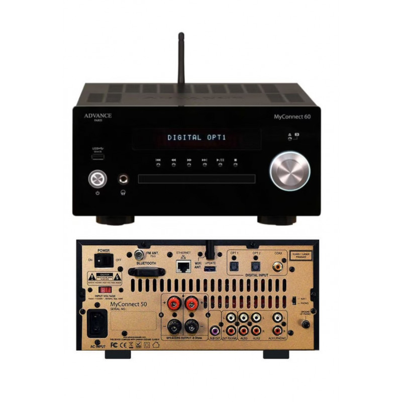 L'ampli Advance Paris My Connect 60 peut facilement être connecté à internet et au réseau local grâce à son double contrôleur réseau WiFi et Ethernet. Il est ensuite possible  d'écouter plusieurs milliers de radios internet, d'accéder à de nombreux services de musique en ligne comme Spotify, Deezer, Qobuz, Tidal, etc. L'ampli connecté Advance Paris My Connect 60 est également compatible DLNA pour lire de la musique partagée sur le réseau domestique. Tous les derniers formats audio sont pris en charge jusqu'à 24 bits / 192 kHz par le DAC Wolfson WM8740 de l'ampli. La lecture de ces fichiers peut également être effectuée à partir d'un disque dur externe relié sur le port USB A en façade de l'ampli Advance Paris My Connect 60. Enfin, un lecteur CD ainsi qu'un récepteur tuner FM et DAB+ sont également disponibles.