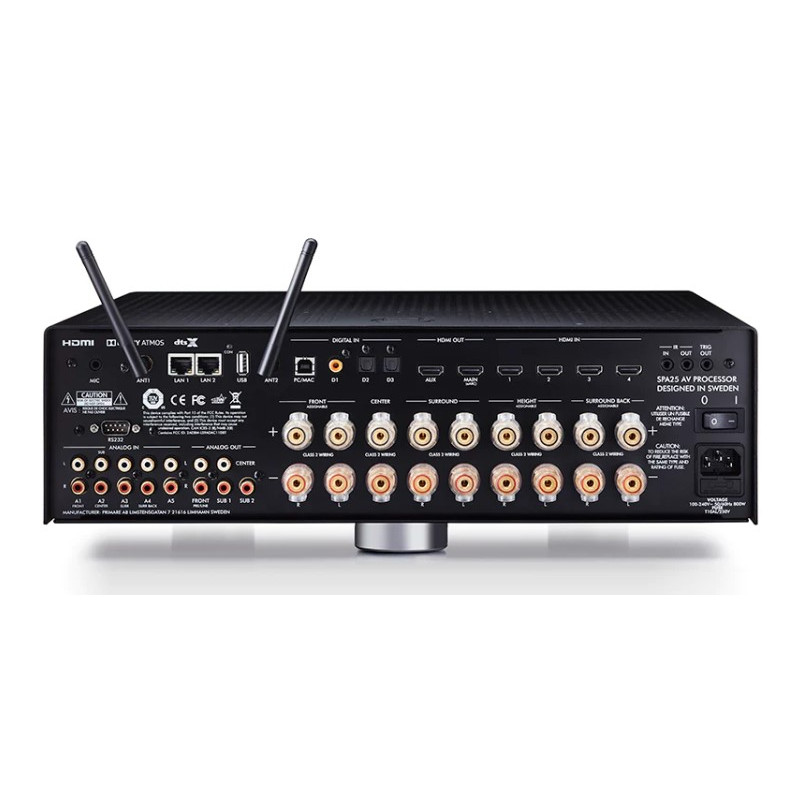 Le SPA25 est un amplificateur et processeur intégré à neuf canaux, conçu pour fournir des performances home cinéma supérieures, associant le dernier traitement Atmos/DTS X, Dirac Live EQ, la commutation 4K HDR, eARC et la technologie éprouvée de lecteur réseau Prisma de Primare avec la puissance prodigieuse de 100 watts par canal, tous les canaux alimentés. Les options d'attribution des haut-parleurs permettent de bi-amplifier les principaux canaux gauche et droit, ainsi que la possibilité d'être au cœur d'un système audio immersif complet à onze canaux avec l'ajout d'un amplificateur stéréo.